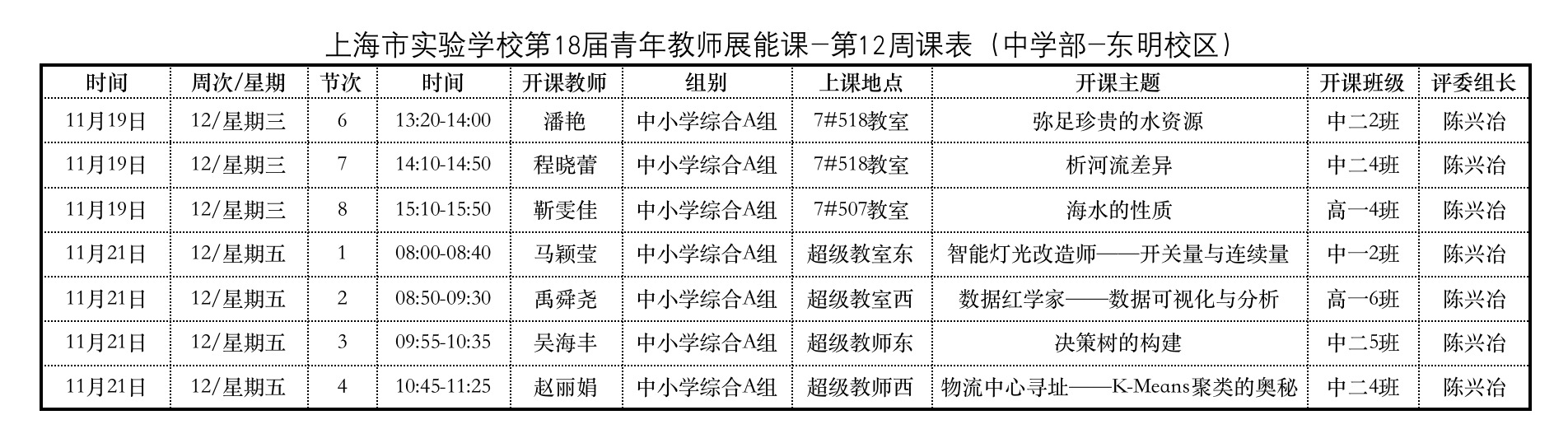 备注 | (手机查看时,请横屏) 请会务申请人提前将申请表提交部门审核(纸质登记表下载) 第十三周(11/24-11/28)每周安排日程填报,请点击此处填写 本周的青年教师展能课课表(见链接) | |||