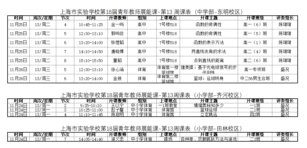 备注 | (手机查看时,请横屏) 请会务申请人提前将申请表提交部门审核(纸质登记表下载) 第十四周(12/1-12/7)每周安排日程填报,请点击此处填写 本周的青年教师展能课课表(见链接) | |||