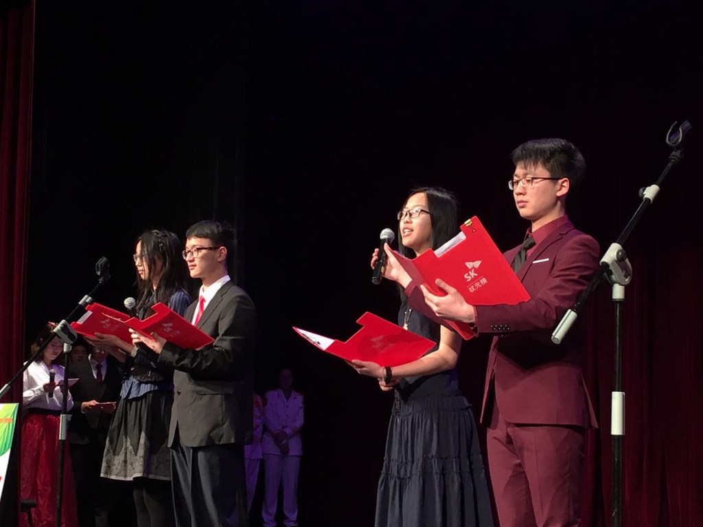仪式在国歌唱响的黄浦剧场举行。同学们每个人的头上,都戴上了一顶火红的星形学士帽,象征着他们即将步入成年,带着知识与梦想奋发向前。奏唱校歌国歌之后,同学们欣赏了由学生代表们表演的诗朗诵。诗很长,从儿时的回忆,到成长的历程,再到对于未来的展望,台上穿着华丽正装的少年少女们用自己的深情演绎了他们对于成人的理解,也引发了台下同学们的一致共鸣。朗诵结束,现场爆发出一阵热烈的掌声。