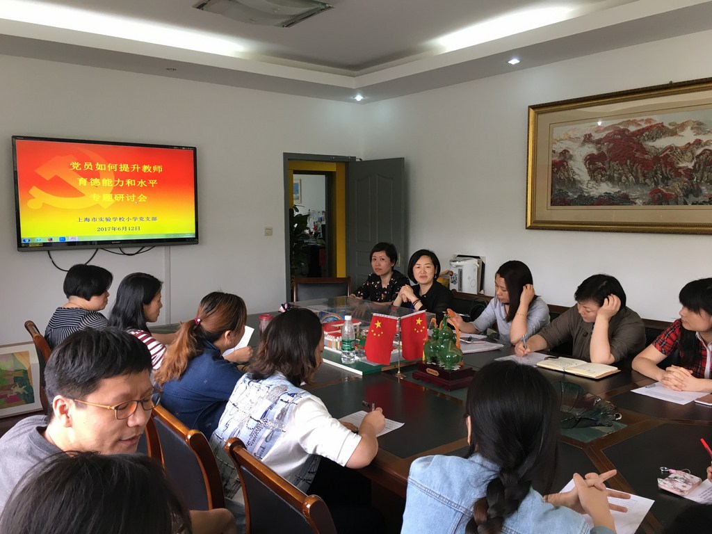 2017年6月12日下午,上实小学党支部党员教师集中会议室开展党课专题学习。本次学习由支部书记范莉老师主持,全体党员教师围绕“党员如何提升教师育德能力和水平”这一主题展开研讨。