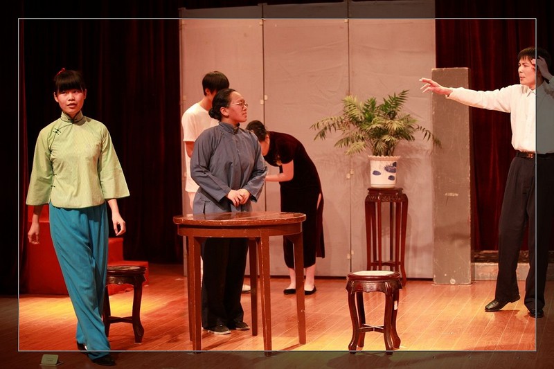 所谓“台上一分钟,台下十年功”,背后的辛劳是可想而知的。从不懂表演到站上舞台,这本是一个循序渐进的长期过程,但时间却是十分紧迫。为此学校请来了上海师范大学谢晋影视艺术学院的赵国栋老师,带领同学们走进话剧表演。在对《雷雨》剧本进行了一定的解读后,他们开始对词、走台,并在这一过程中,进一步对话剧的一些细节方面进行学习和调整,例如语音语调、面部神情等等,从中他们慢慢地找到了舞台的感觉。不可不提的是,同学们在排练过程中,真的是投入了极大的心力。他们常说:“台词的背诵并不成太大的问题,最困扰人的是人物的感觉。”的确,不同的年代,不同的年龄层次,他们所演绎的角色有着他们不曾体验、甚至不曾想过的经历,如何将那些喜怒哀乐展现出来才是关键。