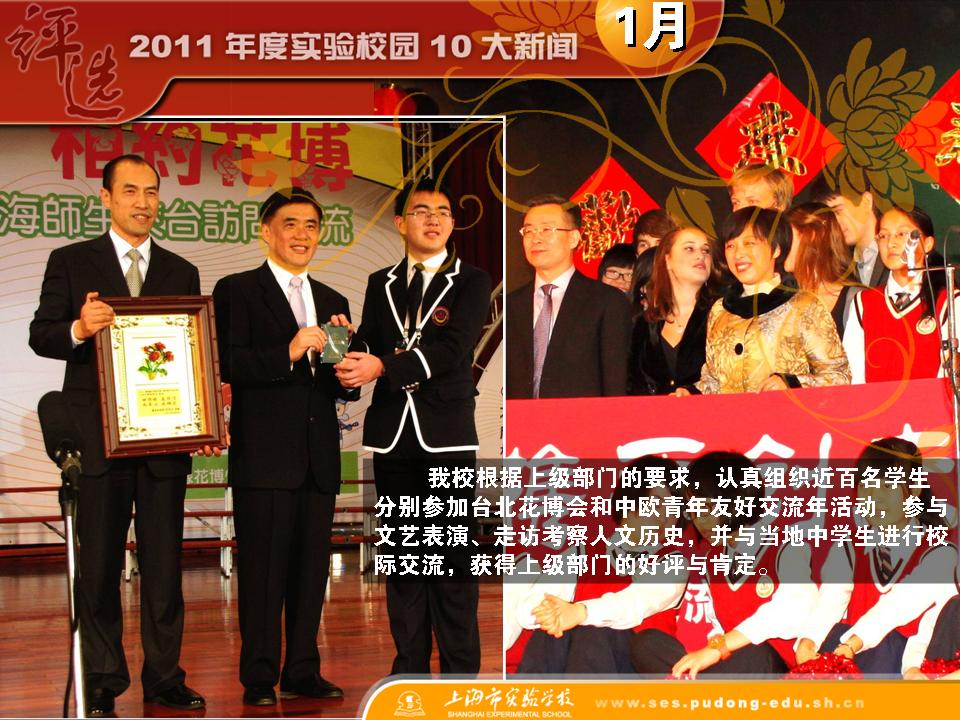 2月,我校有序组织近百名学生分别参加台北花博会和中欧青年友好交流年活动,参与文艺表演、走访考察人文历史,并与当地中学生进行校际交流,获得政府部门的好评和肯定。