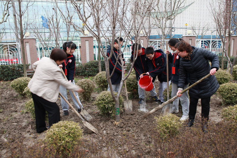 此次校庆纪念林位于大操场南部靠齐河路一带的绿化空地处,3月19日一早,学校部分师生共同举行了简短的栽种仪式,校长徐红老师、校党委书记马季荣老师、副校长瞿祖芳老师以及校长助理曹志豪老师、事务部主任陈兴冶老师共同出席,与学生代表们一起为新栽种的樱花树苗扶根培土浇水。随后的升旗仪式上,曹志豪老师向全校师生介绍了新落成的校庆纪念林情况,并对所有学生提出殷切希望,鼓励同学们奋发图强,与小树苗一同成长,为更美好的明天努力拼搏!