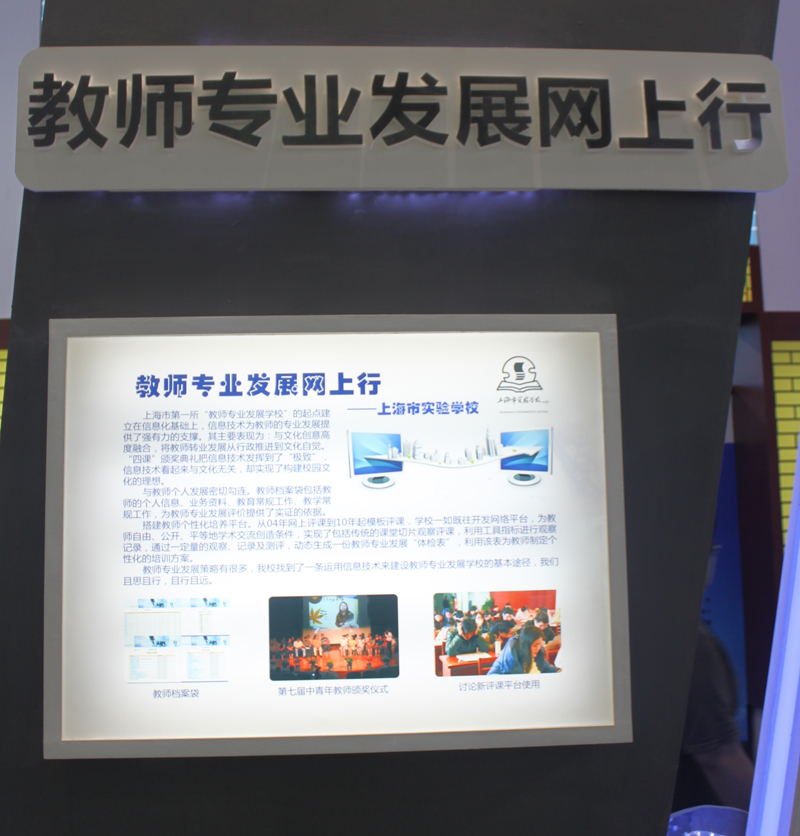 上海展区包含上海市实验学校共有19个不同单位参加此次展演活动,我校展演的内容包括教师的档案袋建设、信息技术与“四课”宣传及颁奖结合、基于教育教学观察的教育教学能力测评系统等。活动从策划准备到组织落实,前后经历了约1个半月,学校领导高度重视,从展演方案确定到会刊文本撰写,全程参与和关注。参观者经过我校展区,无不驻足观看、询问、探讨,对我校信息化工作投来了敬佩的目光。