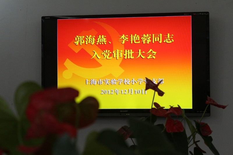 鲜红的党旗,庄严肃穆的氛围,2012年12月10日小学部党支部举行了郭海燕,李艳蓉两位老师的入党审批大会。与会的有上海市实验学校小学部党支部全体党员、两位入党申请老师和两位入党积极分子。
