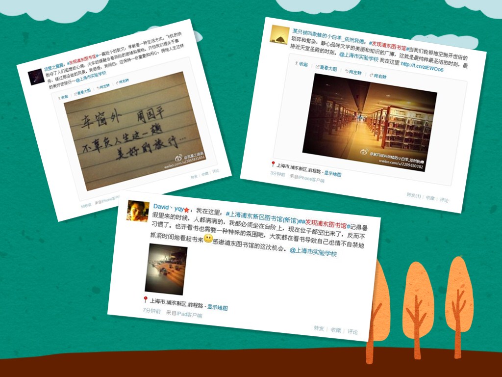 我校第六届读书节开幕活动于3月11日上午在浦东图书馆举行,当天,我校官方微博(weibo.com/iloveses)进行了互动直播。据不完全统计,本次读书节开幕式期间共有近300余条微博在微话题“#发现浦东图书馆#”中“@上海市实验学校”,其中大部分为亲身参与体验的在校学生,也有活跃在微博上的老师们,亦有时刻关注着实验的家长和校友们。大家的评论中,既有对图书馆的现代化设施和优静的阅读环境发出啧啧赞叹,也有将自己看到的好书佳句以及感悟思索,用微评论的方式分享给大家。